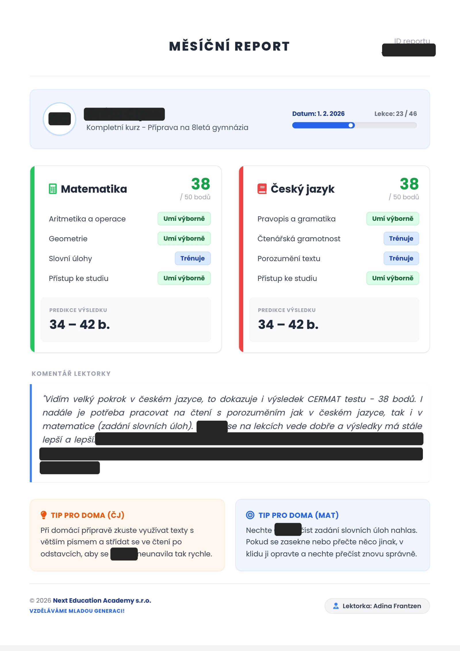 Rodiče mají neustálý přehled: Starost o přípravu můžete s klidem přenechat nám. Každý měsíc vám zašleme přehledný report o tom, co už má student za sebou, jak si stojí a na čem budeme dál pracovat.